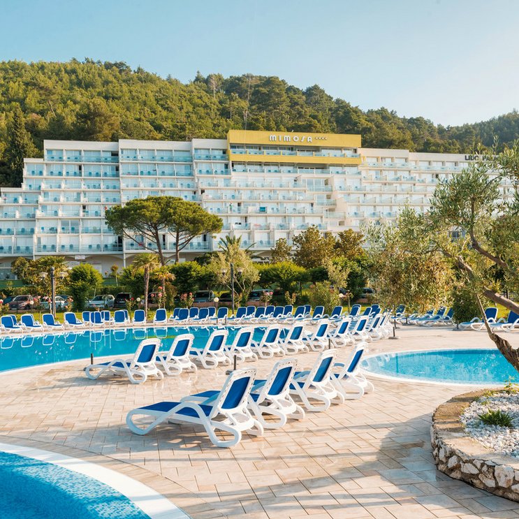 Eingebettet in die Anlage Maslinica blickt das Hotel auf das Meer und die grünen Hügel der Bucht von Rabac. Vier Pools, zwei Hallenbäder, ein Spa sowie viele Aktivangebote und Unterhaltung versüßen den Urlaub.