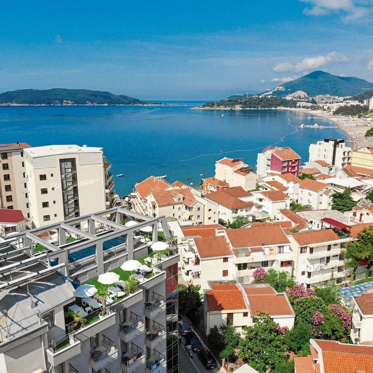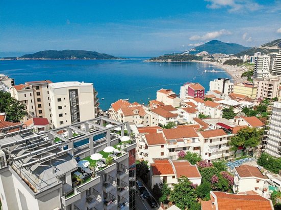 Was für eine Aussicht – weit schweift der Blick vom Rooftop-Pool über die Stadt und die Bucht. Wer genügend Ruhe genossen hat, findet Abwechslung am Strand oder der Altstadt Budvas.