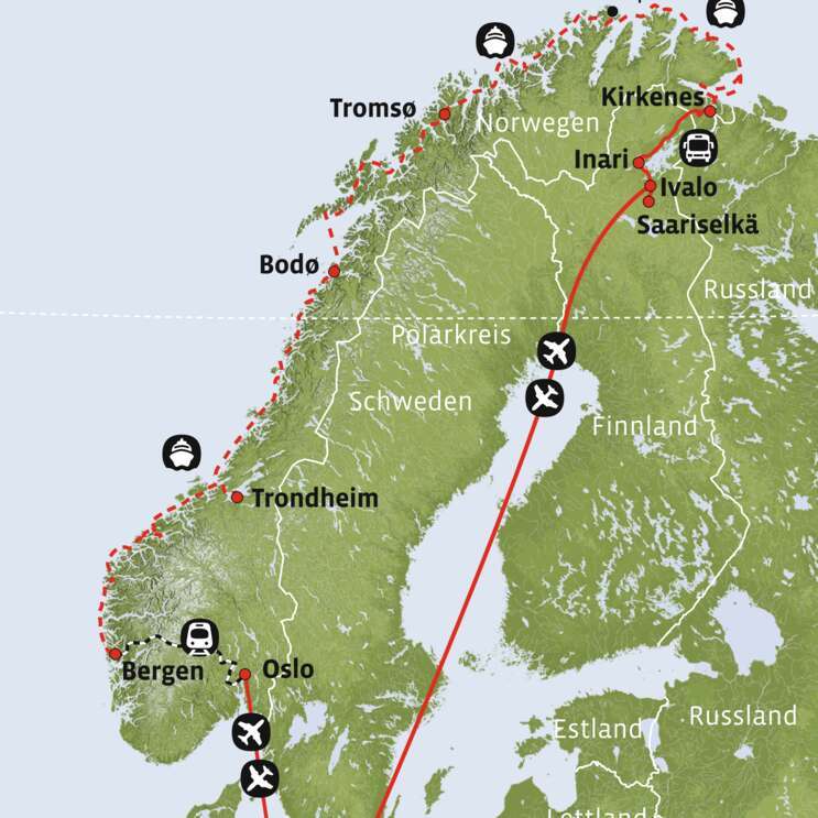 Die perfekte Kombination: Städte, Küste und Winterzauber in Lappland. Tagsüber färbt das sanfte Licht die schneebedeckten Berge in Pastelltöne und in der Nacht kann man mit etwas Glück Polarlichter tanzen sehen. In Finnisch Lappland stehen diverse Winteraktivitäten wie Hundeschlitten- oder Schneeschuhtouren zur Auswahl. Entscheiden Sie selbst, ob die Reise entlang Norwegens Küste, nordwärts oder südwärts führen soll.