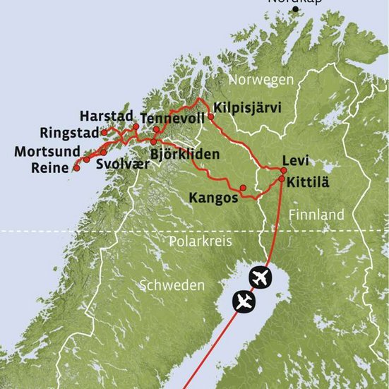 Freuen Sie sich auf eine abwechslungsreiche Fahrt durch die zauberhaften Inselwelten. Unterwegs bietet sich zum Beispiel ein Besuch des pittoresken Fischerdorfs Henningsvær an. Ihr Zuhause für die nächsten zwei Tage heisst Svolvær und erwartet Sie mit einem grossen Aktivitätenangebot. Unternehmen Sie zum Beispiel eine Wanderung oder besuchen Sie das Wikingermuseum in Borg.