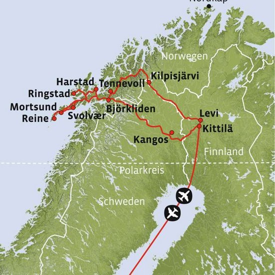 Ihre erste Etappe führt Sie entlang der finnisch-schwedischen Grenze in Richtung Norden bis zum Dreiländereck von Norwegen, Finnland und Schweden. Die kleine Ortschaft Kilpisjärvi zählt kaum 150 Einwohner, liegt jedoch am Fuss der höchsten Berge Finnlands. Bei einer maximalen Höhe von ca. 1300 m muss wohl eher von Erhebungen gesprochen werden. Unternehmen Sie einen Bootsausflug oder entdecken Sie die Umgebung bei einer Wanderung.