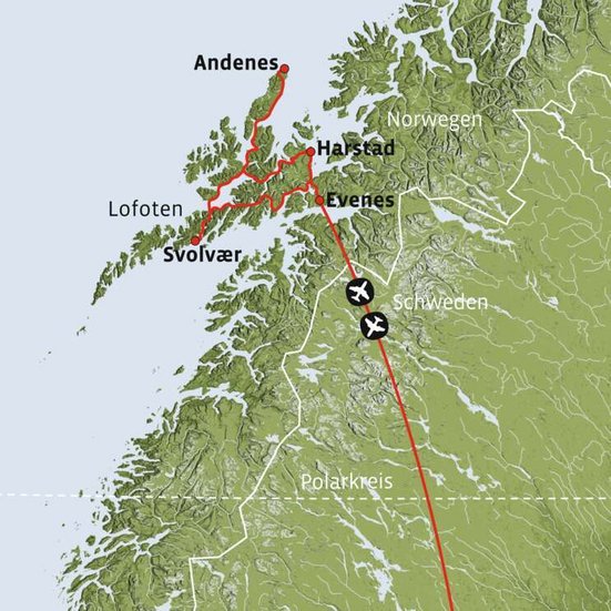Heute heisst es Abschied nehmen von den Lofoten. In ungefähr 2.5 Fahrstunden gelangen Sie zum Flughafen von Evenes, wo Sie Ihren Mietwagen abgeben. Per Direktflug geht es zurück in Richtung Schweiz.