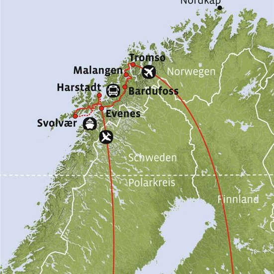 Die norwegischen Küsten und Landschaften haben im winterlichen Kleid ihren ganz besonderen Reiz. Obwohl sich Tromsø als nördlichste Universitätsstadt ganz mondän gibt, hat es nichts von seinem nordischen Charme eingebüsst. Hinter den Toren der Stadt erwartet Sie die arktische Wildnis mit ihrer einzigartigen Flora und Fauna. Geniessen Sie die Vielfalt des authentischen Norwegens auf dieser einzigartigen Reise!