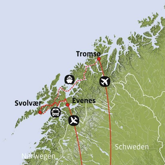 Mietwagen RundreiseUrbanes Stadtleben erwartet Sie im «Paris des Nordens», wie Tromsø auch gerne genannt wird. Die Fahrt mit der Hurtigrute verspricht einzigartige Landschaftsbilder und Ruhe. Von Svolvær aus können Sie die spektakulären Lofoten entdecken. Erleben Sie eine Woche an zwei unterschiedlichen Standorten und tauchen Sie ein in das Wintermärchen Norwegens.
