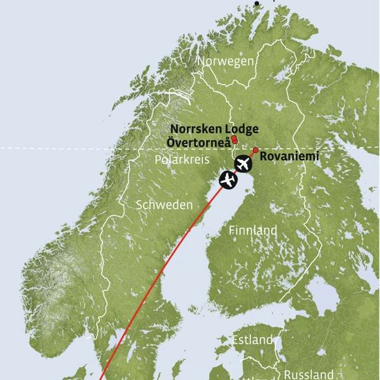Flug nach Rovaniemi und Transfer in die Norrsken Lodge. Nach dem Bezug Ihrer Unterkunft erhalten Sie weitere Informationen zum Wochenprogramm und werden mit wetterfester Kleidung ausgerüstet. Anschliessend werden Sie mit einem feinen Abendessen im Restaurant der Lodge verwöhnt.