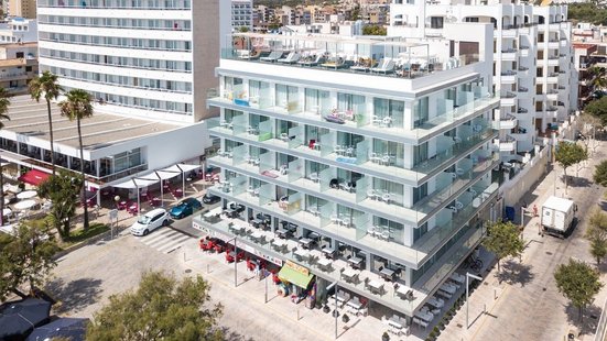 Perfektes Designhotel für alle ab 18 Jahre: Der Blick von der Chill-out-Dachterrasse auf das tiefblaue Meer ist einfach traumhaft. Romantisch wird‘s abends beim Sonnenuntergang – nicht verpassen!