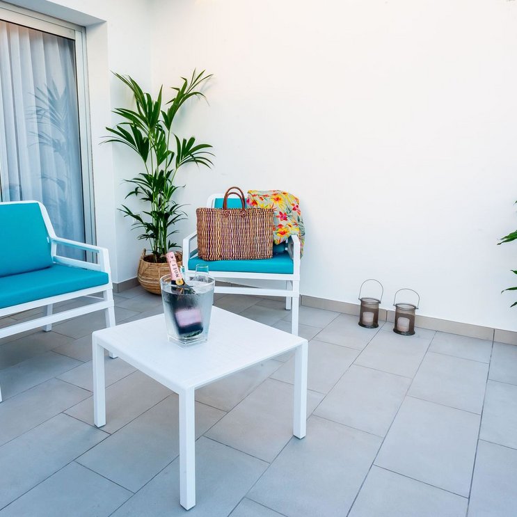 - 36-40 qm, Suite, für Erwachsene ab 16 Jahre, Erdgeschoss, optisch getrennter Wohn-/Schlafraum, 1 Bad, Dusche, WC, Haartrockner, Klimaanlage, Minibar kostenpflichtig, Safe (kostenpflichtig), 1 TV (Sat-TV, Flachbildschirm), WLAN, Wasserkocher, Terrasse (möbliert)
