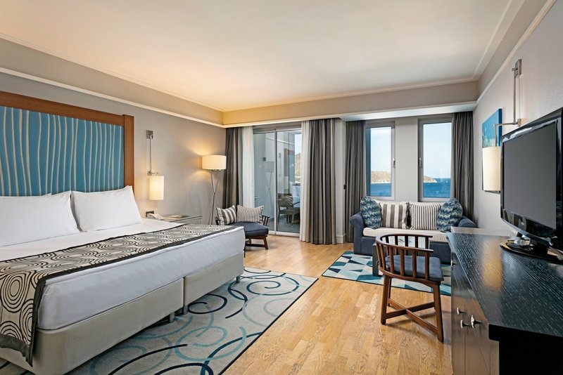 - 51-60 qm, Suite, Meerblick, Gartenblick, Ankleidebereich, Doppelbetten (1 Doppel- oder 2 Einzelbetten), Sofabett, Dusche, Badewanne, WC, Bademantel, Badeslipper, Haartrockner, Kosmetikspiegel, Fliesen, Laminatboden, Klimaanlage, zentral gesteuert, Minibar, Auffüllung täglich, Softdrinks, Snacks, Safe, TV (Sat-TV), Wasserkocher, Kaffee/Tee, Balkon, Kopfkissen-Menü