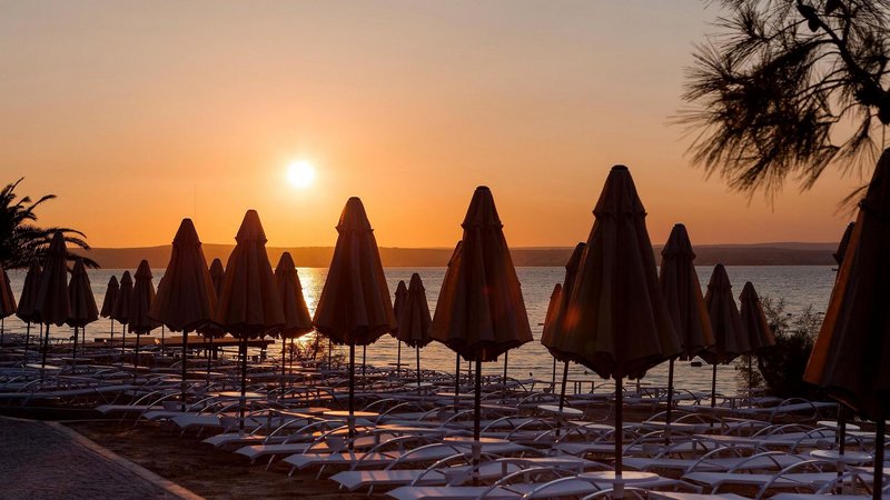 - Sand-/Kieselstrand: ca. 350 m lang, Sonnenschirme, Liegen