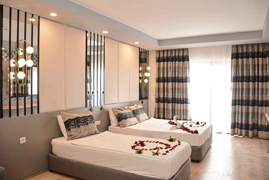 - Familien, mit Verbindungstür, 2 separate Schlafzimmer, 1 Bad, Dusche, WC, Haartrockner, Klimaanlage, individuell regulierbar, Minibar, Auffüllung regelmäßig, Softdrinks, Safe, 1 TV (Sat-TV), Balkon