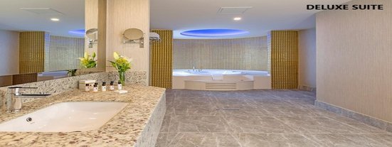 - 151-200 qm, Suite, mit Verbindungstür, Deluxe, Landblick, Poolblick, Nichtraucher, 1 separates Schlafzimmer, 1 separater Wohnraum, Schreibtisch, Dusche, WC, Haartrockner, Holzboden, Klimaanlage, zentral gesteuert, Minibar, Auffüllung regelmäßig, Safe, 1 TV (Sat-TV), Wasserkocher, Balkon, Whirlpool