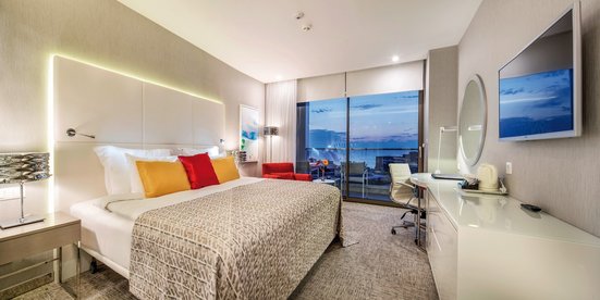 - 26-30 qm, Doppel, Hauptgebäude, Meerblick, Bettwäsche, Handtücher und Matratzen aus 100% Bio-Baumwolle, Schreibtisch, 1 Bad, Dusche, Haartrockner, Teppich, Klimaanlage, zentral gesteuert, Minibar, Auffüllung bei Anreise, Softdrinks, Wasser, Safe, 1 TV (Sat-TV, Flachbildschirm), Wasserkocher, Kaffee/Tee, Balkon (möbliert)