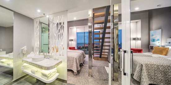 - 41-45 qm, Maisonette, 2 Etagen, Hauptgebäude, Meerblick, Bettwäsche, Handtücher und Matratzen aus 100% Bio-Baumwolle, 2 separate Schlafzimmer, Sitzecke, 2 Twinbetten, französisches Bett, 2 Bäder, Dusche, Haartrockner, Teppich, Klimaanlage, zentral gesteuert, Minibar, Auffüllung bei Anreise, Softdrinks, Wasser, Safe, 2 TVs (Sat-TV, Flachbildschirm), Wasserkocher, Kaffee/Tee, Balkon (möbliert)