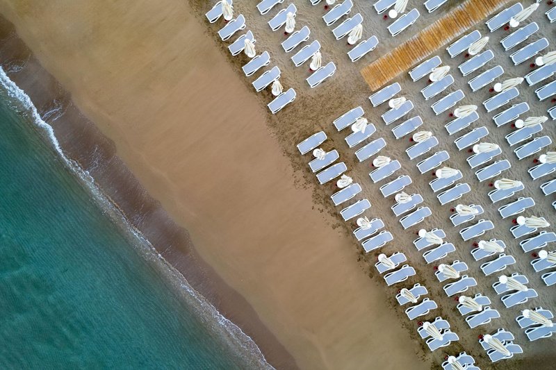 - Sandstrand: leicht abfallend, gehört zur Anlage, Sonnenschirme, Liegen, Strandtuch/Badetuch