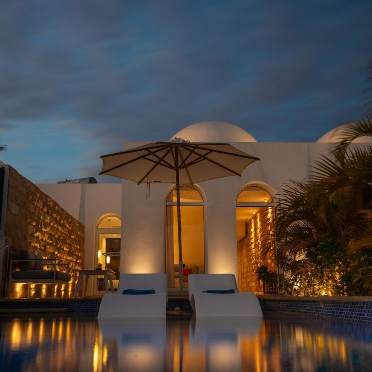 - 61-70 m², villa, vue sur la mer, 1 chambre à coucher séparée, 1 séjour séparé, lit double (king-size), douche, peignoir, chaussures de bain, sèche-cheveux, miroir cosmétique, climatisation, minibar, soft drinks, bière, jus, vin maison, eau, Snacks, coffre-fort, TV, machine à café, terrasse (meublé), accès direct à la piscine, choix d’oreillers, espace de check-in et check-out séparé, esppace séparé à la plage, hors-d'œuvre l'après midi, articles de bain de haute qualité, dîner au restaurant de spécialités, réduction sur les soins spa, service de couverture