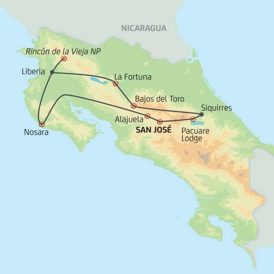 Trajet en direction de l'ouest via Canas pour rejoindre Libéria et continuation jusqu'à Rincon de la Vieja. L'imposant volcan et le parc national du même se situent près de la frontière avec le Nicaragua (145 km).