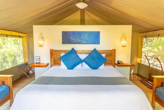 InfrastructureTentes safari de haute qualité, réparties sur la colline. Les tentes sont confortablement équipées et disposent d'une terrasse, d'un lit king-size, d'un petit canapé-lit ainsi que d'un ventilateur de plafond, d'un minibar et d'un coffre-fort. Deux restaurants et une petite piscine complètent l'infrastructure.