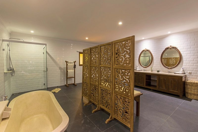 - 81-90 m², villa, bureau, baignoire, douche à effet de pluie, WC, peignoir, chaussures de bain, sèche-cheveux, climatisation, minibar payant, coffre-fort, TV (TV par satellite, écran plat), Wi-Fi, bouilloire, café/thé, véranda (meublée) ou jardin privé, accès direct à la plage, articles de bain de haute qualité, service de couverture, nombre de chambres : 2, à l'arrivée en chambre Corbeille de fruits