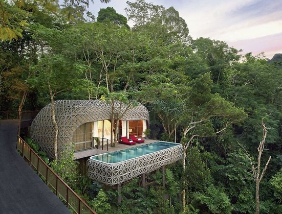 - 121-150 m², villa, vue sur la forêt tropicale, Draps, serviettes et matelas 100% coton bio, douche, douche extérieure, WC, peignoir, sèche-cheveux, climatisation, minibar payant, coffre-fort, planche à repasser, TV (TV par satellite), café/thé, terrasse (meublé), piscine privée