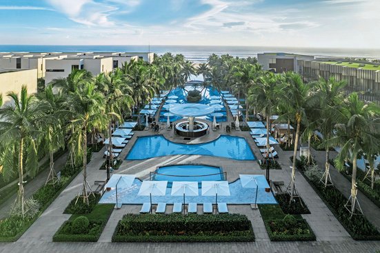 Tradition locale interprétée de manière moderne : telle était la ligne directrice du design de ce luxueux hôtel de plage. Profitez de votre pause dans les cabanes confortables avec vue sur l’océan ou à l’ombre d’une bambou.