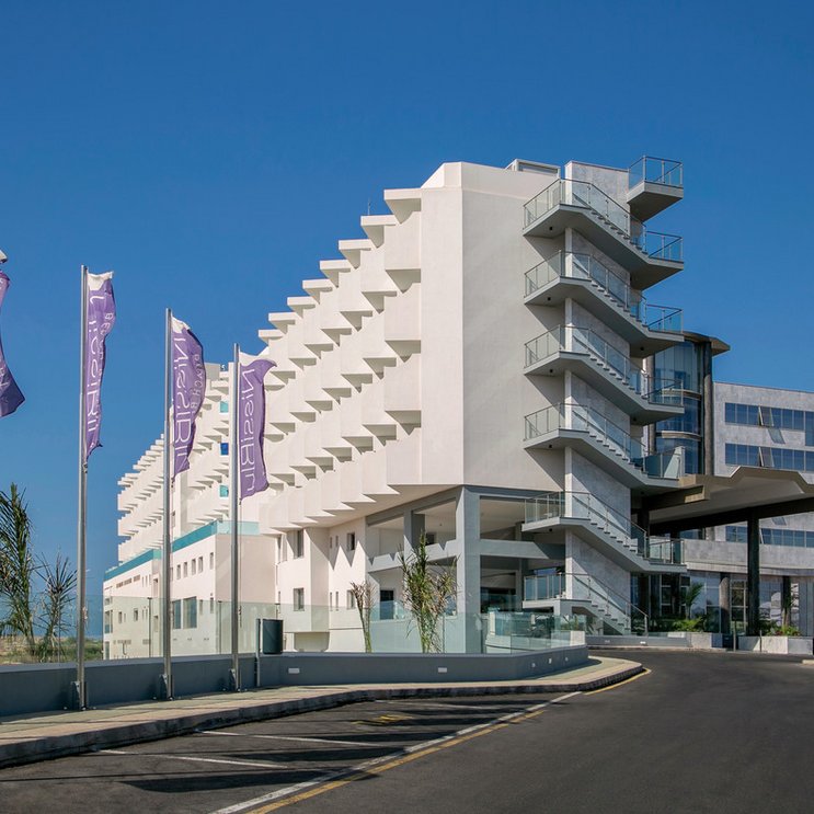 Un centre de villégiature bien entretenu à proximité de la plage de Nissi. L'intérieur élégant a du style : une composition de tons crème, sable et bois, égayée par des palmiers et autres plantes. Dans les chambres, des fenêtres du sol au plafond laissent entrer la lumière et le ciel.