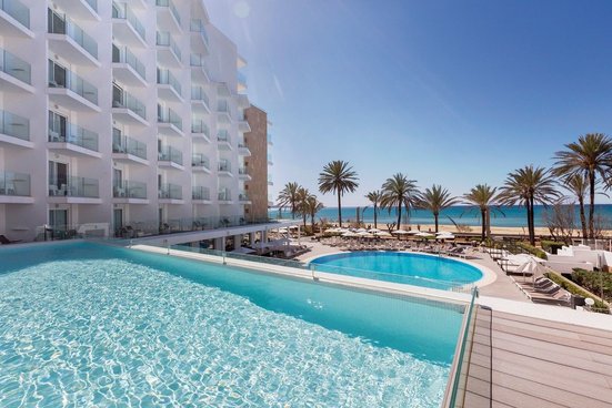 - plage de sable : en pente douce, séparé du complexe par une promenade, bar de plage public, parasols (payant), transats (payant)