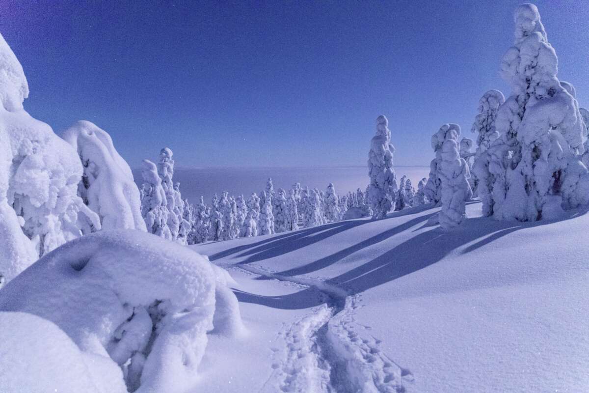 Le paysage hivernal au pied de la montagne de Luosto et au milieu du parc national de Pyhä-Luosto vous invite à l'explorer activement. Que ce soit en raquettes à neige, pendant un tour en traîneau à chiens, en motoneige ou sur les skis de fond sur les kilomètres de pistes.