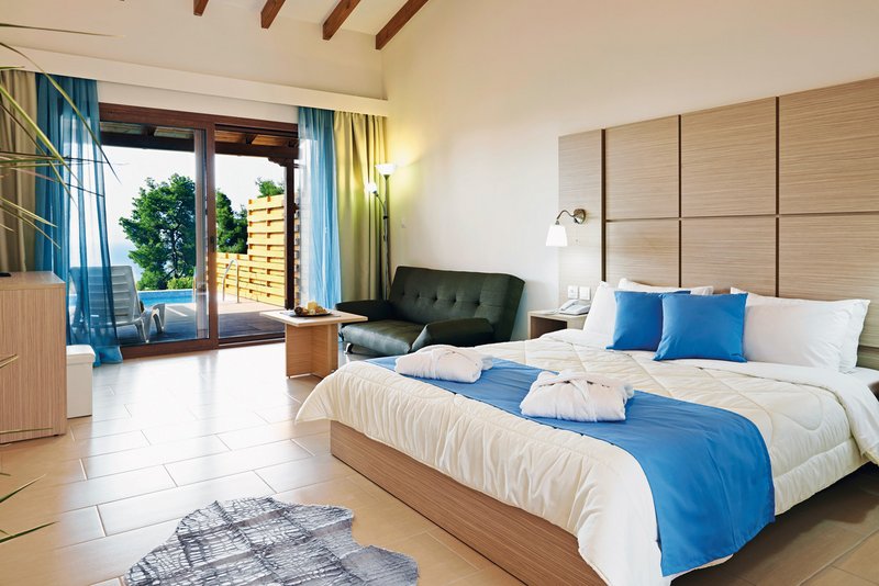 - 26-30 m², Junior Suite, Deluxe, annexe, vue sur la mer, salon/chambre à coucher combinés, douche, 1 WC, peignoir, chaussures de bain, sèche-cheveux, climatisation, réglage individuel, coffre-fort, 1 TV (TV par satellite), bouilloire, café/thé, réfrigérateur, terrasse (meublé), piscine privée