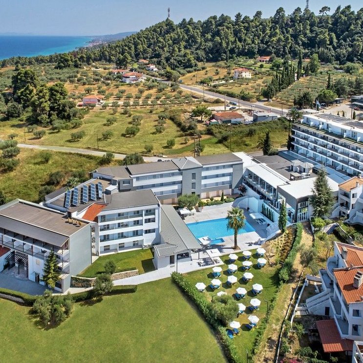 Entouré par le cadre idyllique de la côte ouest de la Chalcidique et offrant une vue imprenable sur la mer, cet endroit est synonyme de calme et de détente. Ici, loin de l'agitation, les familles se sentent particulièrement bien.
