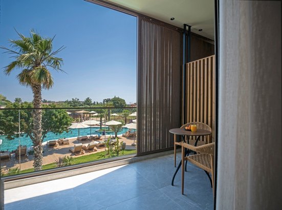 - 26-30 m², chambre double, vue sur la piscine, 1 salle de bain, douche, peignoir, chaussures de bain, sèche-cheveux, climatisation, ventilateur, minibar payant, coffre-fort, TV (TV par satellite), haut-parleur bluetooth, bouilloire, café/thé, balcon (meublé), à l'arrivée en chambre eau