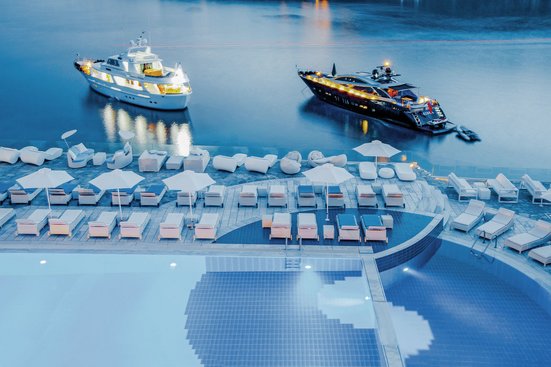 Légèrement surélevé sur une presqu'île, l'hôtel offre une vue spectaculaire sur la mer Égée. Ce rêve en blanc et bleu promet des vacances relaxantes dans une élégance intemporelle avec un confort et un service fabuleux.