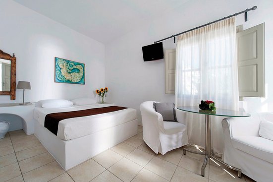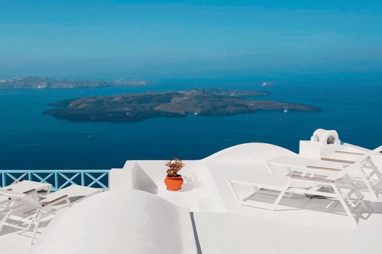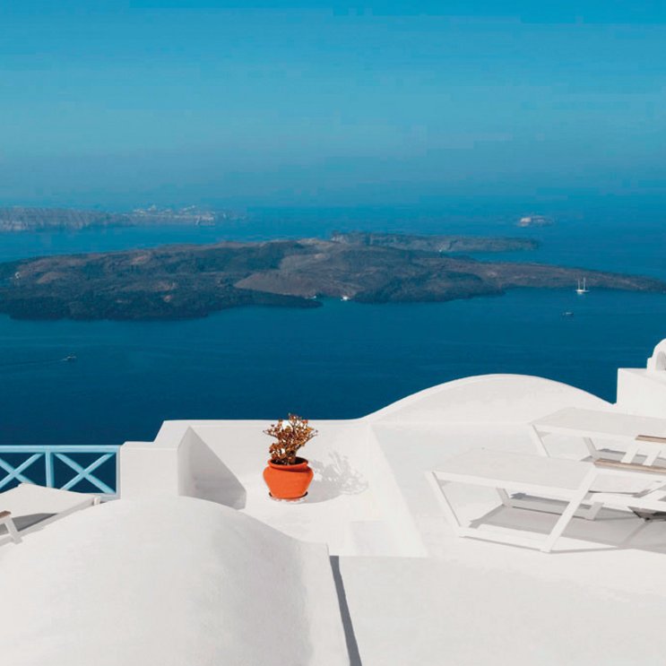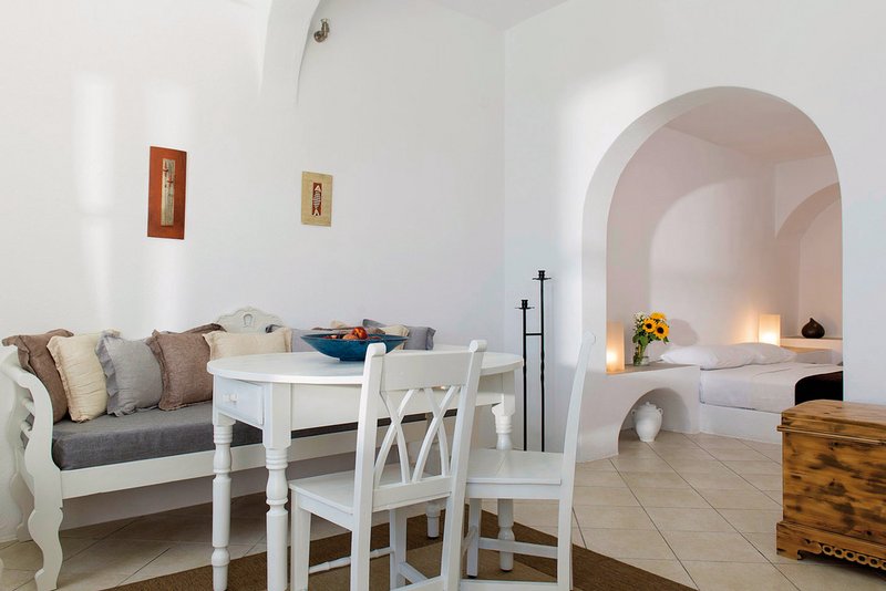 A Imerovigli, les maisons blanches rayonnent de roches volcaniques noires. Tout le complexe des Gorgona Villas est inondé de soleil : vous aurez votre joie éclatante !