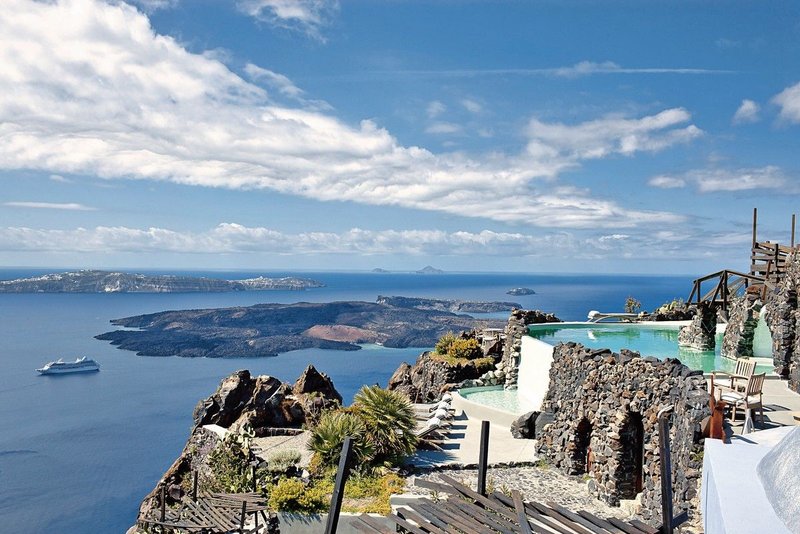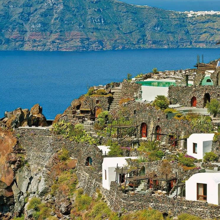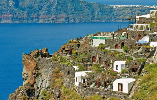 Un séjour plein de romantisme, avec hammam et sauna, attend les hôtes dans un mélange d'habitations troglodytes en terrasses creusées dans la montagne et du noble style blanc des Cyclades grecques.