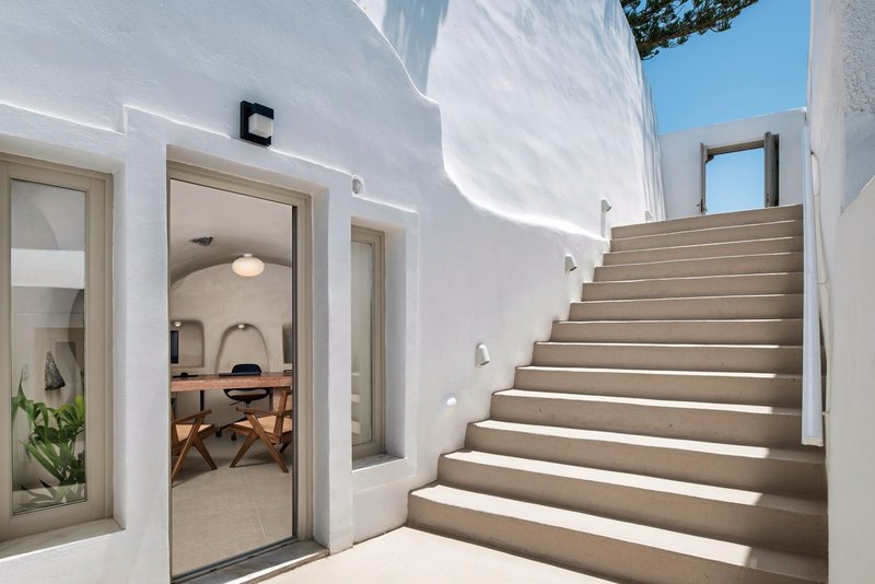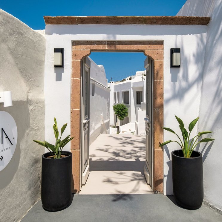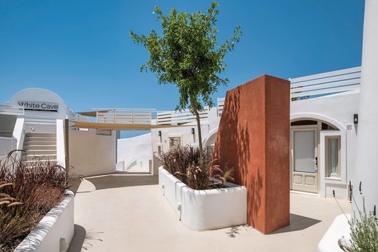 En haut, à la périphérie de Firostefani, une vue imprenable sur la caldeira s’offre dès le petit-déjeuner ! Et l’hôtel sait également séduire par son élégance moderne et ses éléments de design traditionnels.