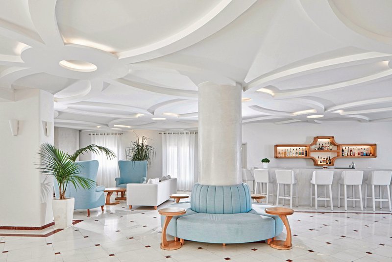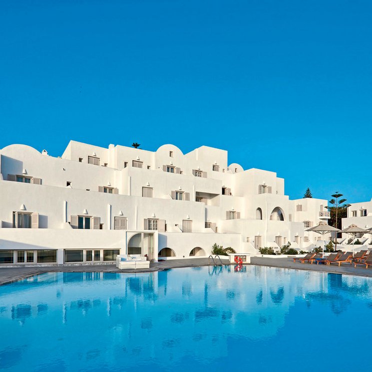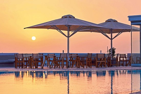 Avec son blanc éclatant, cet hôtel confortable à l’architecture typique des Cyclades contraste avec le bleu profond de la mer Egée qui se trouve à ses pieds. Idéal pour des vacances reposantes !