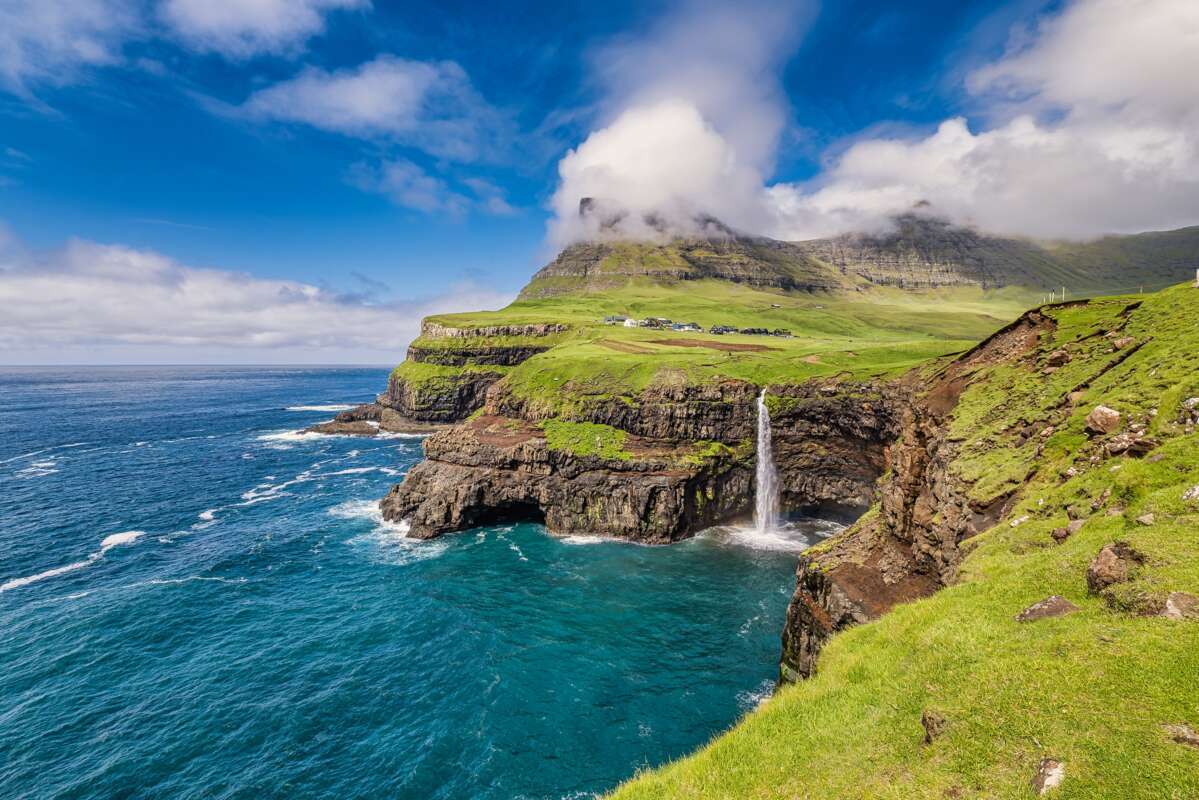 Sur la route côtière, vous avez une belle vue sur l’impressionnante île de Tindhólmur. À Gásadalur, vous trouvez un petit café, un joli point de vue ainsi que la cascade de Múlafossur.