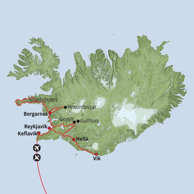 En route pour Reykjavík, un arrêt aux sources chaudes de Hvammsvík s'impose. Passez l'après-midi à flâner dans la capitale islandaise, faites du shopping le long de la Laugavegur et arrêtez-vous dans un des charmants cafés. En soirée, trajet jusqu'à Keflavík et nuitée à proximité de l'aéroport.