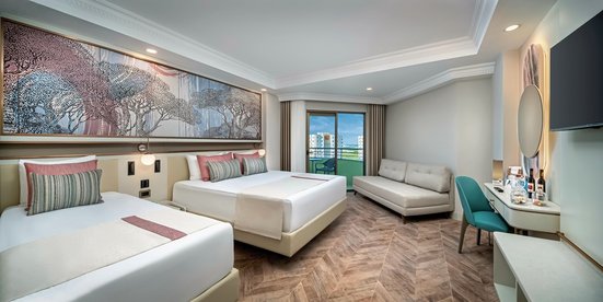 - 41-45 m², familles, avec porte communicante, bâtiment principal, vue sur la mer (latéral), non-fumeur, 2 chambres à coucher séparées, lit simple, canapé-lit, lit français, 1 salle de bain, douche, 1 WC, sèche-cheveux, climatisation, commande centrale, minibar, remplissage régulièrement, coffre-fort, 2 TVs (TV par satellite), Wi-Fi, bouilloire, café/thé, balcon