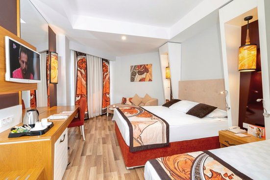 - 31-35 m², familles, avec porte communicante, bâtiment principal, 2 chambres à coucher séparées, lits jumeaux, lit français, 1 salle de bain, douche, 1 WC, sèche-cheveux, miroir cosmétique, sol stratifié, climatisation, commande centrale, minibar, remplissage régulièrement, coffre-fort (payant), 1 TV (TV par satellite, écran plat), bouilloire, café/thé, balcon
