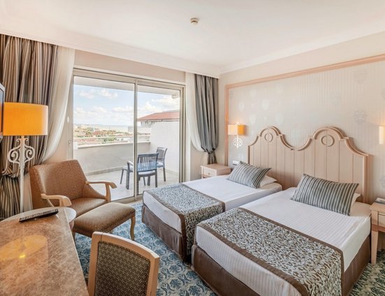 - 46-50 m², chambre double, bâtiment principal, côté mer, vue sur la mer, bureau, lit simple, lit double, baignoire, WC, peignoir, chaussures de bain, sèche-cheveux, moquette, climatisation, commande centrale, minibar, remplissage quotidien, soft drinks, eau minérale, bière, coffre-fort, TV (TV par satellite, smart-TV), bouilloire, café/thé, balcon