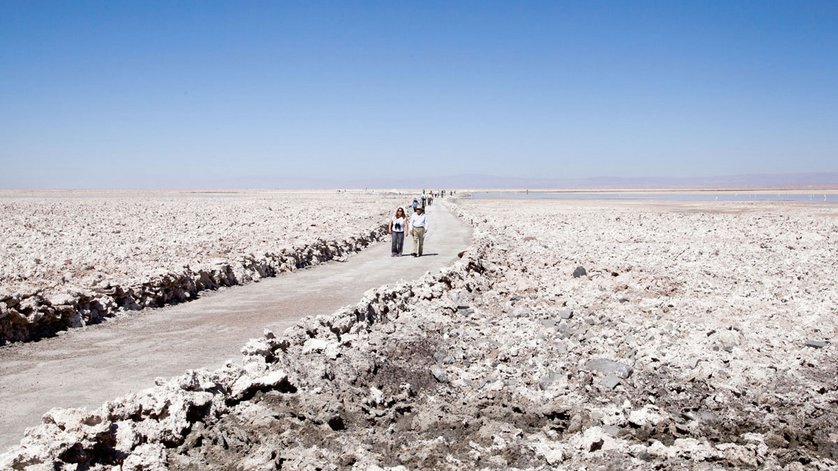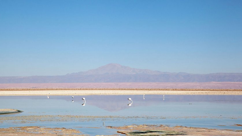 Salar de Atacama : cet immense lac salé est célèbre pour les flamants roses qui y vivent. Une grande partie du lac est recouverte d’une croûte de sel, dont les crêtes dentelées forment un paysage bizarre. La partie supérieure est constituée par une lagune d’un bleu profond où les flamants roses trouvent leur nourriture.