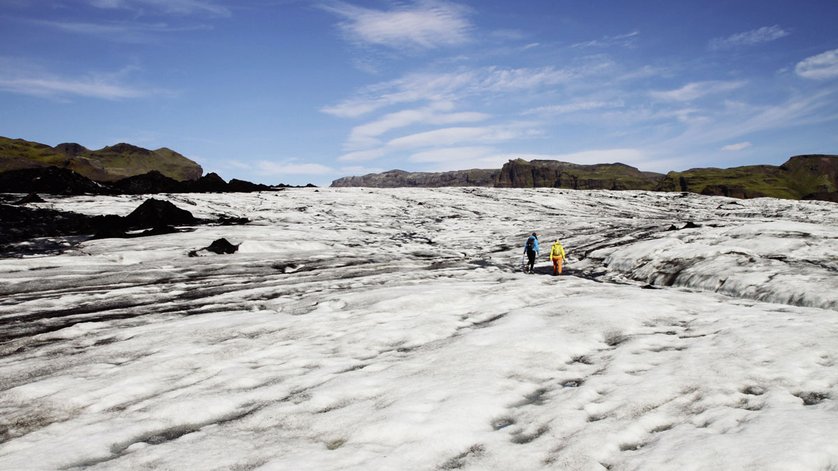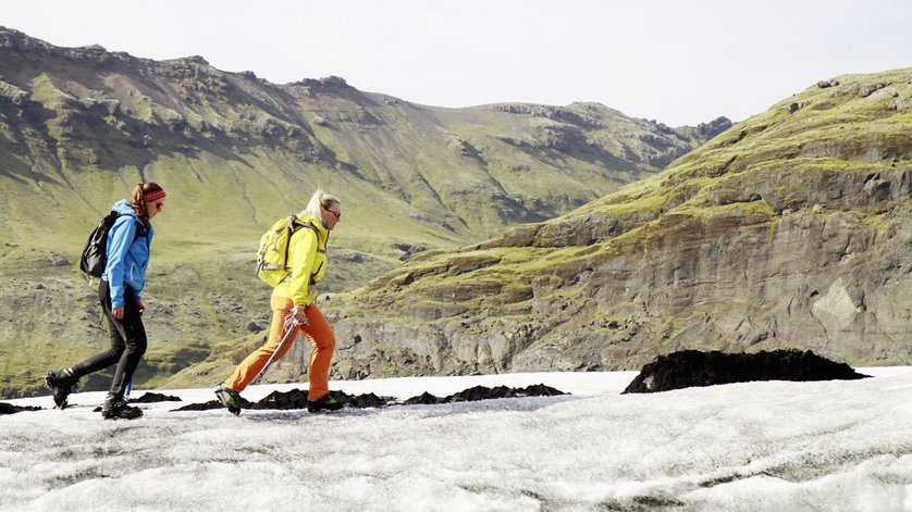 Sólheimajökull: Sans hésitation aucune, une promenade sur le glacier de Sólheimajökulls fait partie des expériences inoubliables en Islande. Équipés de crampons et de piolets, nous suivons Villa qui sautille habilement sur les crevasses et les formations de glace.
