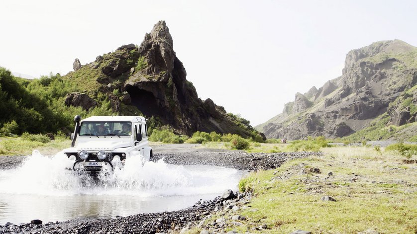 Þórsmörk: Après une baignade prolongée, nous poursuivons notre aventure en direction du massif montagneux de Þórsmörk, aux crêtes déchiquetées et recouvert de forêts. Nous y passons la nuit dans une cabane, pour pouvoir poursuivre notre aventure dès le lendemain. Il nous reste 20 kilomètres à parcourir, sur des chemins caillouteux parsemés de traversées de rivières et de gués. Encore une fois, nous bénissons notre robuste Defender. Sur le chemin, nous croisons quelques autres véhicules restés à l’arrêt. Nous arrivons tard le soir à la cabane, après une journée riche en événements et nous sommes accueillis par des aurores boréales magiques. Nous avons vécu l’un des nombreux moments de ce séjour qui nous ont laissés sans voix.