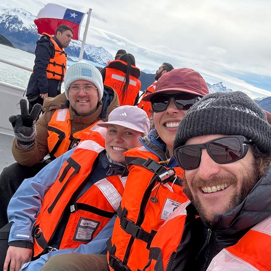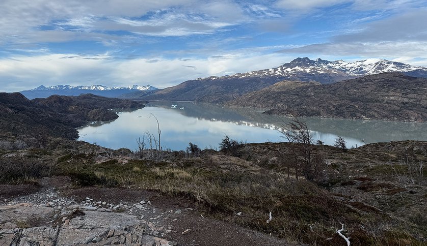 Je m’attaque ensuite à quelque chose de plus ambitieux : l’expédition « Grey Glacier », longue de 12,5 kilomètres. En tant que randonneur expérimenté, c’est tout à fait faisable pour moi, mais cela reste tout de même un défi passionnant. Après avoir traversé le lac Pehoé en catamaran, nous parcourons une partie du célèbre W-Trek, un sentier rocailleuxCe nom désigne un sentier en forme de W qui longe l’imposant massif du Paine, traverse la « French Valley » et revient au « Glaciar Grey ». Nous sommes accompagnés par trois guides locaux : Vito, photographe freestyle, Morena, femme de caractère, et Flo, passionnée de culture, dont l’amour pour le cinéma du monde entier nous rapproche immédiatement. À la fin de la journée, elle me remet une liste de recommandations personnelles. Vito et moi nous nous entendons si bien qu’il me fait même la surprise de m’offrir un tirage photographique du Lago Grey.