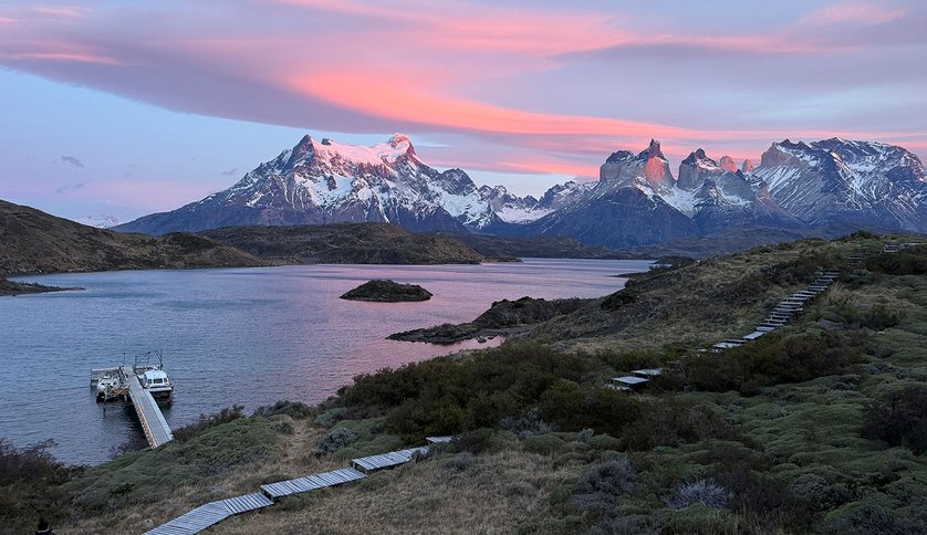 Nous commençons par une randonnée facile dans la partie est du parc national Torres del Paine, où nous pouvons ressentir l’esprit des temps anciens. Outre des paysages d’herbe à perte de vue, des lacs pittoresques et une faune variée — dont une centaine de pumas ! — je découvre des peintures rupestres vieilles de 4 000 ans réalisées par le peuple indigène Aónikenk. C’est Antonio, un jeune Chilien d’une trentaine d’années, qui m’apprend tout cela. Sourire espiègle, sourcil percé... et une biographie inspirante : autrefois, il extrayait du lithium (qui reste l’un des principaux produits d’exportation du Chili) dans une mine. Aujourd’hui, il guide des visiteurs du monde entier à travers sa véritable patrie, le parc national. Ce mélange d’histoires personnelles et d’informations instructives me fait complètement oublier le temps qui passe, et nous voilà de retour au lodge après environ quatre heures et demie.