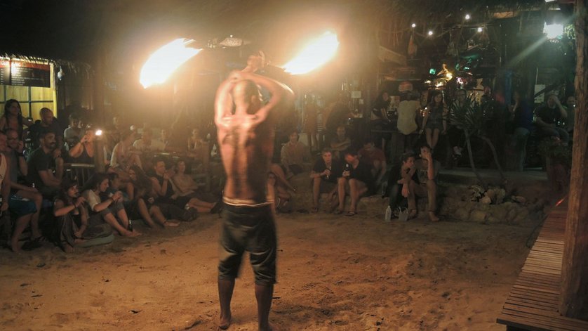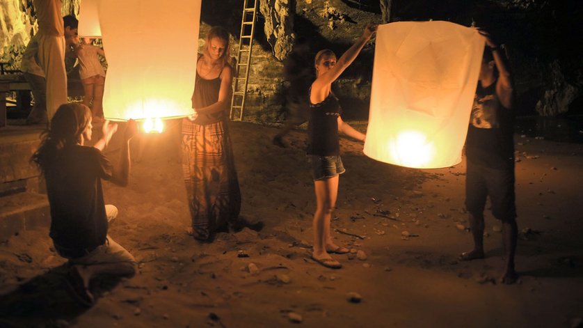 Après des heures et des heures d’une boucle sans fin de l’escalade, de retombées, de plongée, de natation et d’escalade, nous revenons épuisés à la plage de Ton Sai. Nos gorges, desséchées par l’eau salée et le soleil, sont assoiffées pour une Singha fraiche, sirotée sur les lits en bois devant le Freedom Bar, offrant une vue parfaite sur la plage, la mer et les rochers d’escalade. Le soleil s’enfonce dans la mer, pendant que l’on discute des actions du jour et que les Singhas se suivent. Lorsqu’il fait enfin nuit, les habitants et les escaladeurs se rassemblent sur la plage, munis de lanternes en papier blanc. Il est temps pour la Loi Krathong, la fête thaïlandaise des Lumières. Symboliquement, les mauvaises pensées sont écartées avec les lanternes volantes, tandis que l’âme restée derrière, ainsi purifiée, peut recommencer. Nous allumons également les combustibles de nos lanternes et retenons l’enveloppe en papier à la verticale jusqu’à ce qu’elle se remplisse d’air chaud et lui permette de s’envoler toute seule. Puis nous nous tenons tous debout sur la plage, la tête en arrière, regardant les lanternes qui échappent sans effort à la gravité contre laquelle nous nous sommes battus toute la journée.