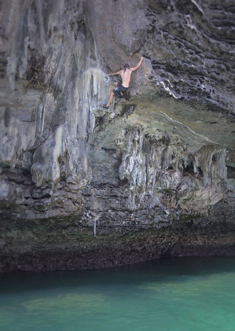 Alors que mon corps fonce avec une accélération de 9,8 m/s2 dans l’air chaud et humide de l’Asie du Sud-Est, les spectateurs sur le petit bateau se taisent subitement. Même si dans l’escalade Deep Water Solo, DWS en abrégé, la question de la chute n’est pas « si ? » mais « quand ? », une dégringolade involontaire depuis de grandes hauteurs est toujours un spectacle fascinant pour tous les participants. Ce sport consiste à grimper seul et sans corde (= solo) au-dessus des eaux profondes, équipé uniquement de chaussures d’escalade. Le choix de la route pour le DWS est largement libre, de même que le choix de la hauteur à atteindre.