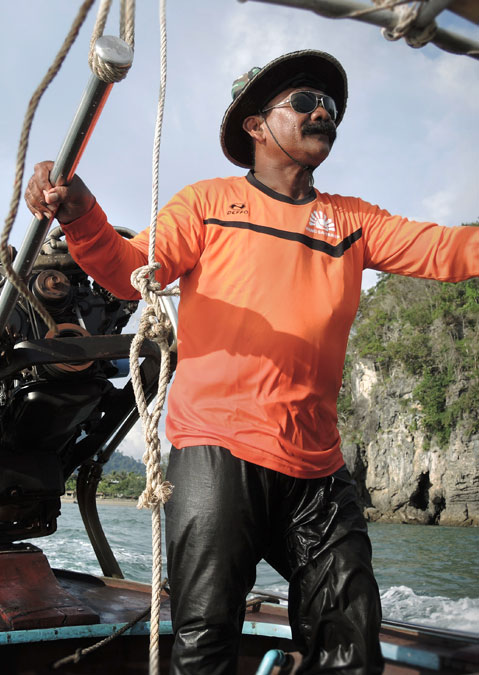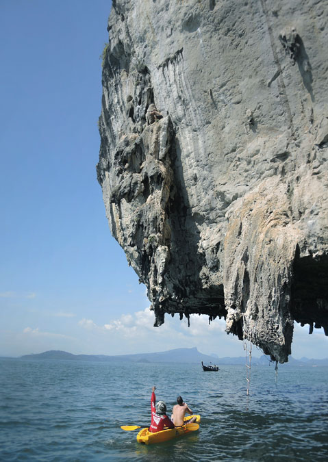 Quelques heures auparavant, lorsque j’étais assis au petit déjeuner sur la plage de Ton Sai avec mes deux compagnons et que je défendais les bananes fraîches contre des singes insolents, nous ne savions pas encore exactement à quoi nous attendre. Le petit village du sud de la Thaïlande est connu des escaladeurs pour la variété de ses voies d’escalade et pour son ambiance décontractée. En plus du mélange de plage et d’escalade, nous avons été particulièrement attirés par les nombreuses possibilités du DWS. Lorsque, à 10 h du matin, nous sommes montés à bord du « longboat » motorisé avec six autres escaladeurs et deux guides, le suspense était d’autant plus vif.