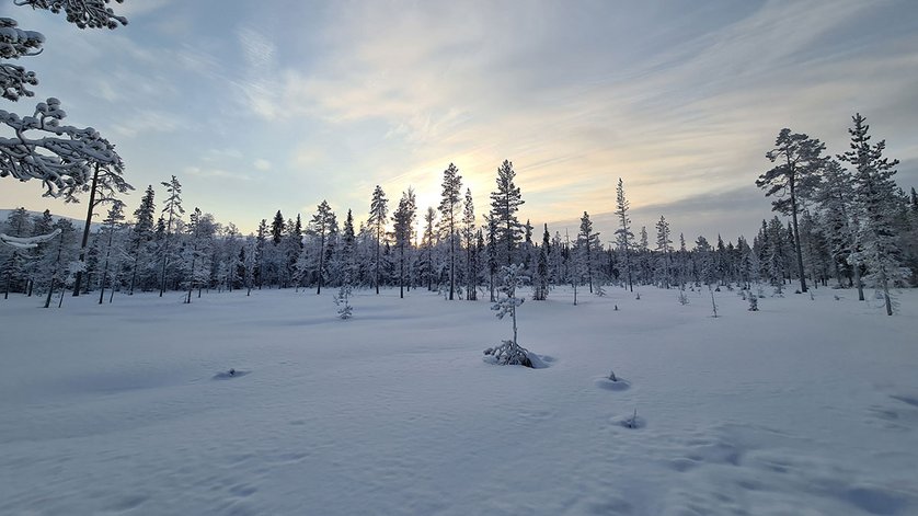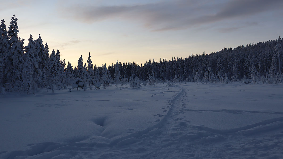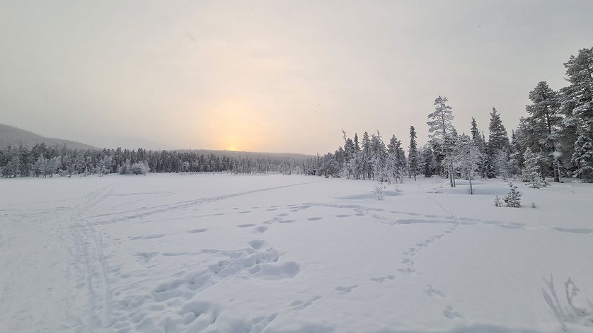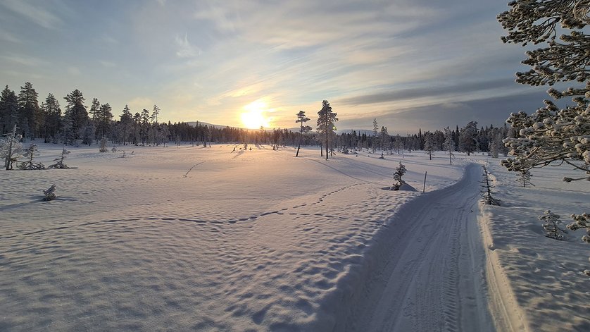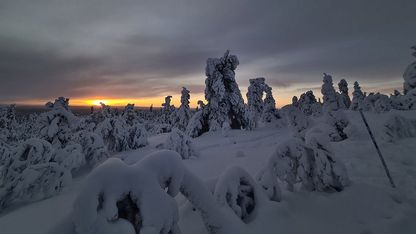 Aujourd'hui, c'est mon premier jour de congé et je veux être actif. Mais avec toutes les impressions que j'ai accumulées ces deux dernières semaines, j'ai oublié que nous sommes déjà le 23 décembre. Il ne me reste que peu de temps avant le coucher du soleil. J'enfile rapidement mes vêtements chauds et prépare mes raquettes. Ma première destination : la « Pyhän Laurin Kappeli » − l'église d'Äkäslompolo. De là, je continue sur le Kuer − l'une des sept montagnes entourant Äkäslompolo. Le sentier me mène à travers une forêt romantique profondément enneigée, à travers des clairières lumineuses jusqu’au sommet du Kuer. Arrivé là-haut, je sens mon cœur palpiter et je m'aperçois que je savoure, figé comme une pierre, la vue sur l'immensité du paysage lapon, le tout couronné par un coucher de soleil pittoresque, presque kitsch, qui colore le ciel dans des tons jaune orangé. Je suis à deux doigts de pleurer de joie.