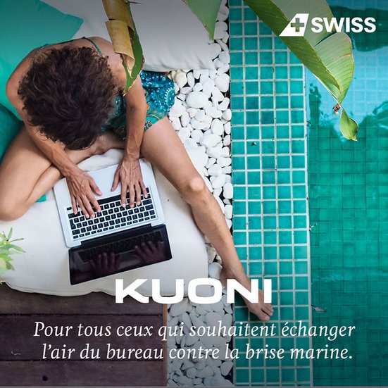 Travail ou vacances – pourquoi pas les deux ? Kuoni et Swiss International Air Lines sont les partenaires parfaits pour une workation inoubliable dans la destination de vos rêves. Que ce soit une réunion au bord de la piscine, une fin de journée dans le désert ou une pause-café dans la jungle. Laissez-vous convaincre par cette nouvelle forme de travail et laissez-nous vous conseiller.